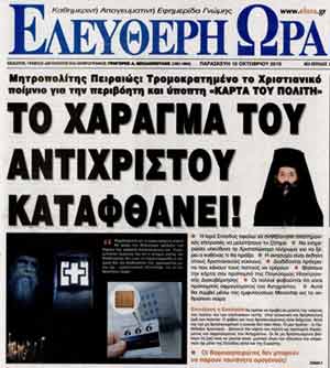 Φημολογείται ότι η συγκεκριμένη κάρτα θα φέρη τον δυσώνυμο αριθμόν του θηρίου της οριακής Αποκαλύψεως του Ευαγγελιστού Ιωάννου και ότι ο στόχος αυτής της διαδικασίας θα είναι να προετοιμασθή ο κόσμος δια την διαδικασίαν του χαράγματος μέσω της εμφυτεύσεως microchip εις το ανθρώπινον σώμα.» ( στο εικονιζόμενο φύλλο της «Ελεύθερης Ώρας» 15.10.10).