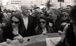 [στην φωτογραφία ο Γιώργος σε διαδήλωση για τα δίκαια των εργαζομένων, πλαισιωμένος με διακεκριμένους συνδικαλιστές]