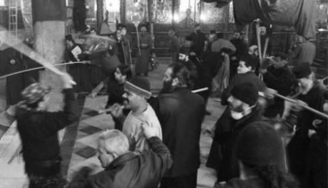 Στην φωτογραφία -Πανάγιος Τάφος: Παραδοσιακό άγριο ξύλο μεταξύ Ελλήνων και Αρμενίων μοναχών