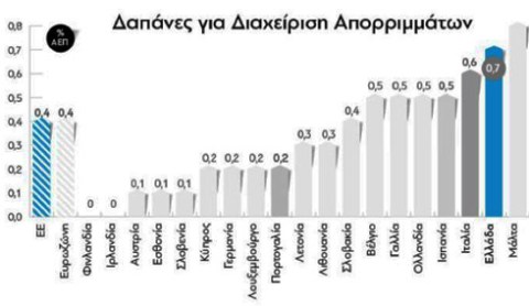 Διότι η χώρα μας ξοδεύει το μεγαλύτερο (εκτός Μάλτας) ποσοστό στην Ε.Ε., 0,7% του ΑΕΠ, σε δαπάνες για διαχείριση απορριμμάτων.