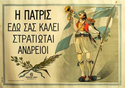 «Η πατρίς εδώ σας καλεί στρατιώται ανδρείοι», Α’ Παγκοσμίου Πολέμου. Αφίσα διαστάσεων 56×83 εκ.(Εθνικό Ιστορικό Μουσείο)