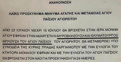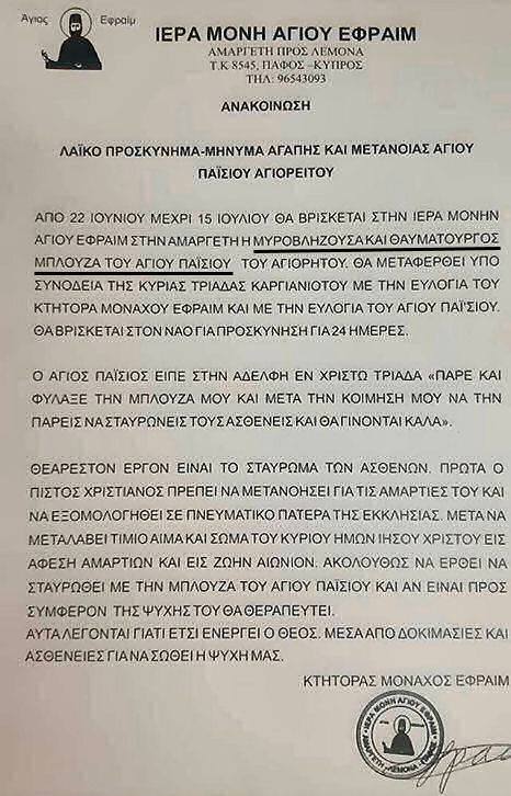 Ο Άγιος Παΐσιος είπε στην αδελφή Εν Χριστώ Τριάδα: «Πάρε και φύλαξε τη Μπλούζα μου και μετά την κοίμησή μου να την πάρεις να σταυρώνεις τους ασθενείς και θα γίνονται καλά.»
