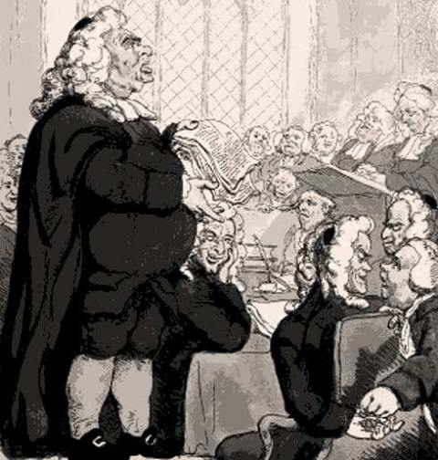 A judge declaiming with eyes directed upwards, while another seated beneath his gaze, in the foreground, exchanges money with a desperate-looking man [British Museum]