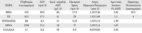 Η διαφορά στο κατά κεφαλήν ΑΕΠ μεταξύ Αμερικής και Κίνας είναι σημαντική. Ο εξωτερικός δανεισμός της Αμερικής είναι επίσης σημαντικός (της Κίνας είναι άγνωστος, αν υπάρχει). Η Κίνα συνεχίζει να υπερέχει στο εξαγωγικό εμπόριο. Η Αμερική προηγείται σε δαπάνες εξοπλισμού. Οι αριθμοί για την ΕΕ, την Γερμανία και την Ελλάδα προσθέτουν επιπλέον ενδιαφέρον γιατί περιπλέκουν την εικόνα. Οι παίκτες γίνονται πολλοί. Ακόμα, η Αμερική έχει σημαντικό πρόβλημα παράνομης μετανάστευσης ‒ πολύ μεγαλύτερο εκείνου της Ευρώπης. Είναι και αυτό απόρροια της παγκοσμιοποίησης.