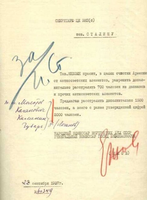 Ο συν. Μικογιάν παρακαλεί στο πλαίσιο της εκκαθάρισης της Αρμενίας από τα αντοσοβιετικά στοιχεία την άδεια να εκτελέσει επιπλέον 700 άτομα από τους οπαδούς του Ντασνάκ και άλλων αντισοβιετικών στοιχείων.