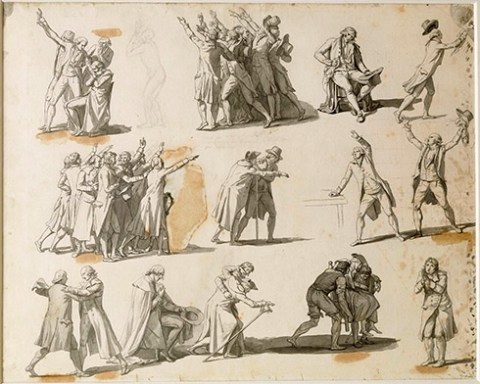 Jacques Louis David: Deputies and Groups of Deputies: Sheet of Fourteen Studies for ‘The Oath of the Tennis Court,’ circa 1790–1791 (RMN–Grand Palais, Paris/Art Resource)