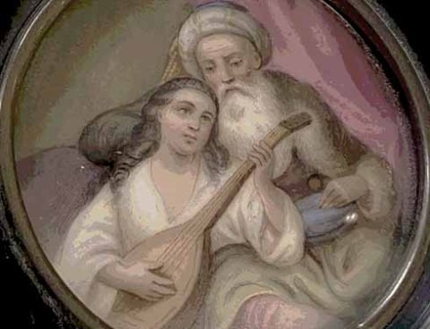Αλή Πασάς και κυρά Φροσύνη. Μικρή πορσελάνινη πλάκα, ζωγραφισμένη στο χέρι, σε παλιά γνήσια κορνίζα. 19ος αι.