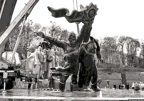 Ένα μνημείο της σοβιετικής εποχής για τη φιλία μεταξύ Ουκρανίας και Ρωσίας κατεβαίνει στο έδαφος από έναν γερανό αφού κόπηκε από την πλίνθο του στο κέντρο του Κιέβου στις 26 Απριλίου. Photo: rferl.org