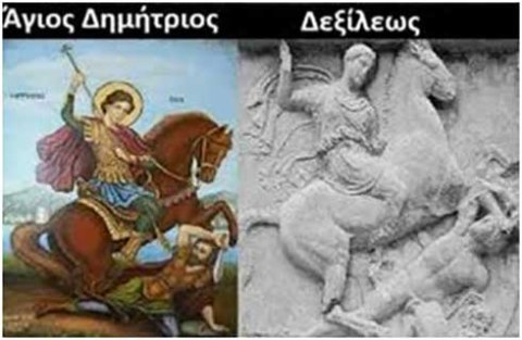 (Πιστεύεται ότι το αυτό ανάγλυφο ήταν πρότυπο για την κατασκευή – αργότερα – των εικόνων των αγίων Δημητρίου και Γεωργίου).
