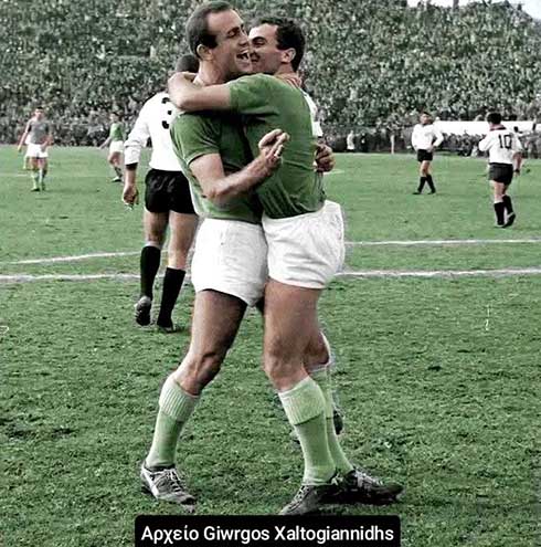 Φωτό – Ο Μίμης Δομάζος ανοίγει το Σκορ στο 16′ λεπτό και πανηγυρίζει με τον Τάκη Λουκανίδη