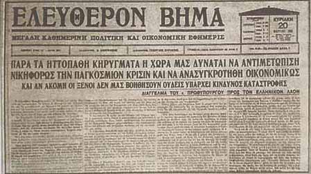 «Παρά τα ηττοπαθή κηρύγματα η χώρα μας δύναται να αντιμετωπίση νικηφόρως την παγκόσμιον κρίσιν και να ανασυγκροτηθή οικονομικώς. Και αν ακόμη οι ξένοι δεν μας βοηθήσουν ουδείς υπάρχει κίνδυνος καταστροφής», έγραφε το Ελεύθερον Βήμα στις 20 Μαρτίου 1932. Ένα μήνα αργότερα η Ελλάδας (26 Απριλίου) κήρυξε πτώχευση η οποία τυπικά άρχιζε από την 1η Μαρτίου 1932.