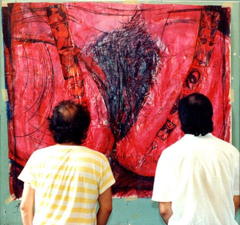 1987: Ένα από τα φοβερά αιδοία του Π. Μαυρόπουλου. Έργο από έκθεση στη πλατεία Δεξαμενής στη γκαλερί «Επίπεδα» – τραβηγμένη στο εργαστήριο της Πανόρμου στο Βύρωνα. Αριστερά ο Παναγιώτης και δεξιά ο Αγριμολόγος (τότε που διέθετε μία σχετική ποσότητα τριχωτού της κεφαλής…)
