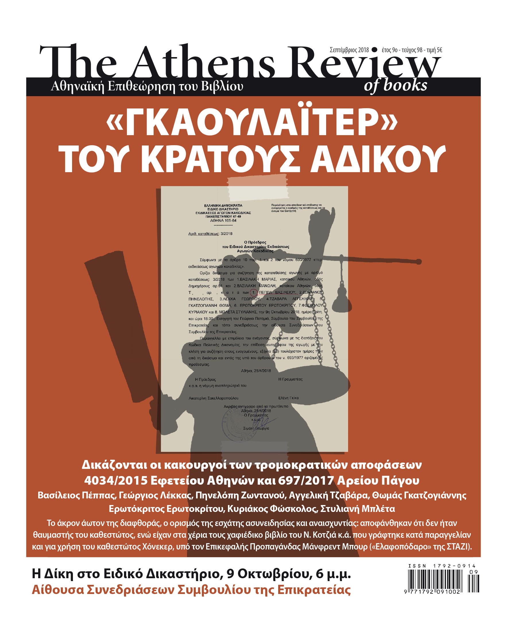 Παρακαλούμε να κάνετε γνωστό, σε όσο περισσότερους πολίτες είναι δυνατόν, το γεγονός ότι θα πραγματοποιηθεί η δίκη της ηγεσίας του Αρείου Πάγου στο Ειδικό Δικαστήριο αγωγών κακοδικίας, στην αίθουσα συνεδριάσεων του Συμβουλίου της Επικρατείας στις 9 Οκτωβρίου, ώρα 6 μ.μ. Όλα τα εξωφρενικά που διεπράχθησαν εις βάρος μας σε αυτή την αποκρουστική υπόθεση συντελέστηκαν μέσα στη σιωπή και πίσω από κλειστές πόρτες. Η δύναμή μας, και προπαντός η ασφάλειά μας, είναι η ενημέρωση των πολιτών. Όσο για μας, συνεχίζουμε απτοήτω γλώσση. Για να γιορτάσουμε μαζί μετά το πέρας της δίκης τα 100 τεύχη της Athens Review of Books, τον 10ο χρόνο της ζωής της.